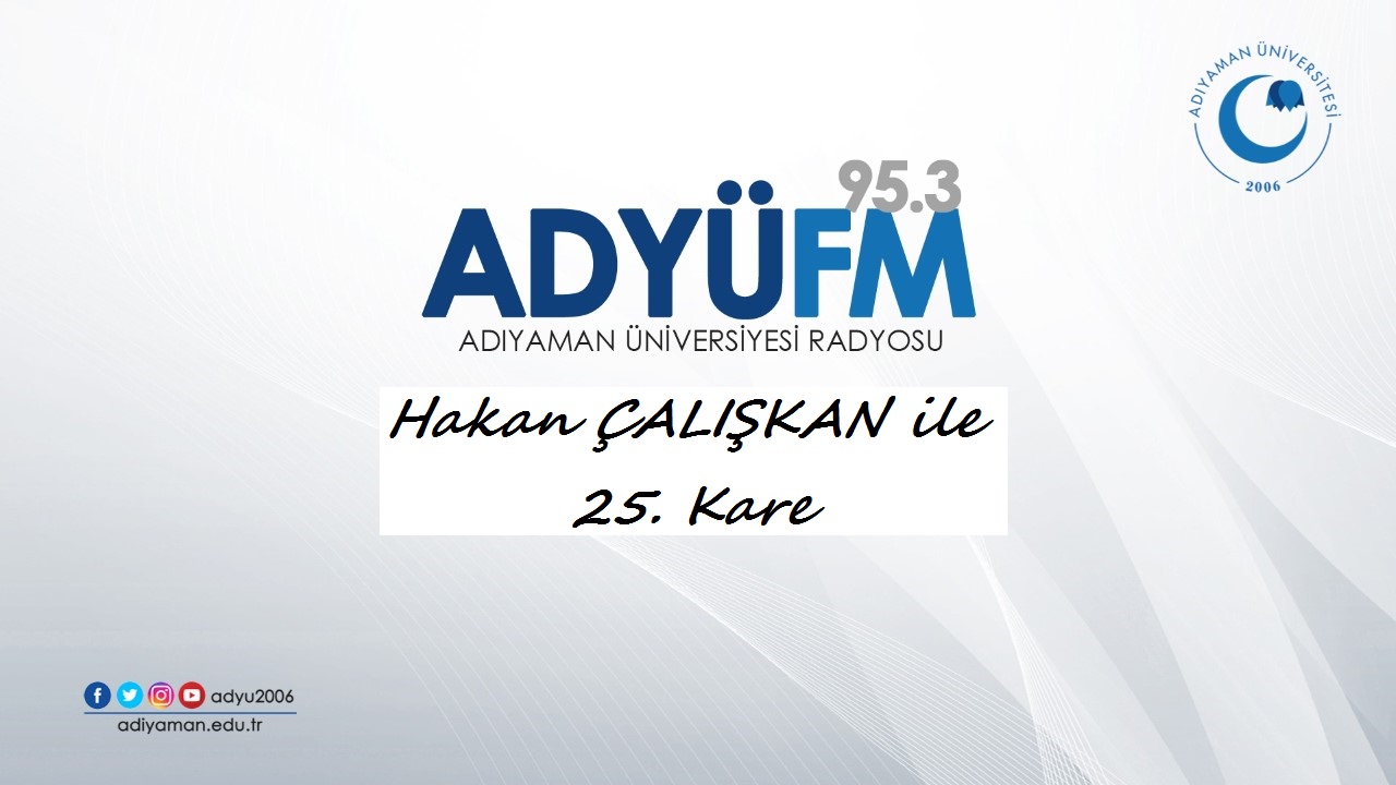 Hayat bir filmse eğer sonunda bir finali olan, yaşadığımız her kareden bir ders çıkarmanın yanı sıra bir mesajımızda olmalı aslında. Hayata ve yaşadıklarımıza dair her konuda asıl görmemiz ve göstermemiz gereken film karesini anlatabilmek adına her çarşamba saat 14:00' da Hakan ÇALIŞKAN ile 25. Kare Programı ADYÜ FM' de kulak hizalarınızda.